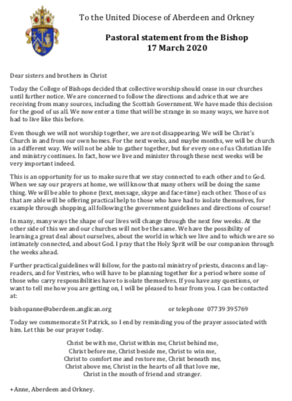 March 17, 2020 Pastoral letter from Bishop Anne. Uncategorized Share this: Share on X (Opens in new window) X Share on Facebook (Opens in new window) Facebook Like Loading... Related Rev'd Lynsay A priest and poet in the Scottish Episcopal Church, exploring the workings of the Holy Spirit in Banchory .