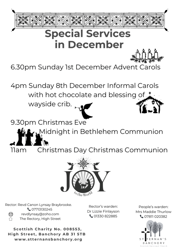 November 23, 2024November 26, 2024 December 2024 Advent, Services Share this: Share on X (Opens in new window) X Share on Facebook (Opens in new window) Facebook Like Loading... Related Rev'd Lynsay A priest and poet in the Scottish Episcopal Church, exploring the workings of the Holy Spirit in Banchory .